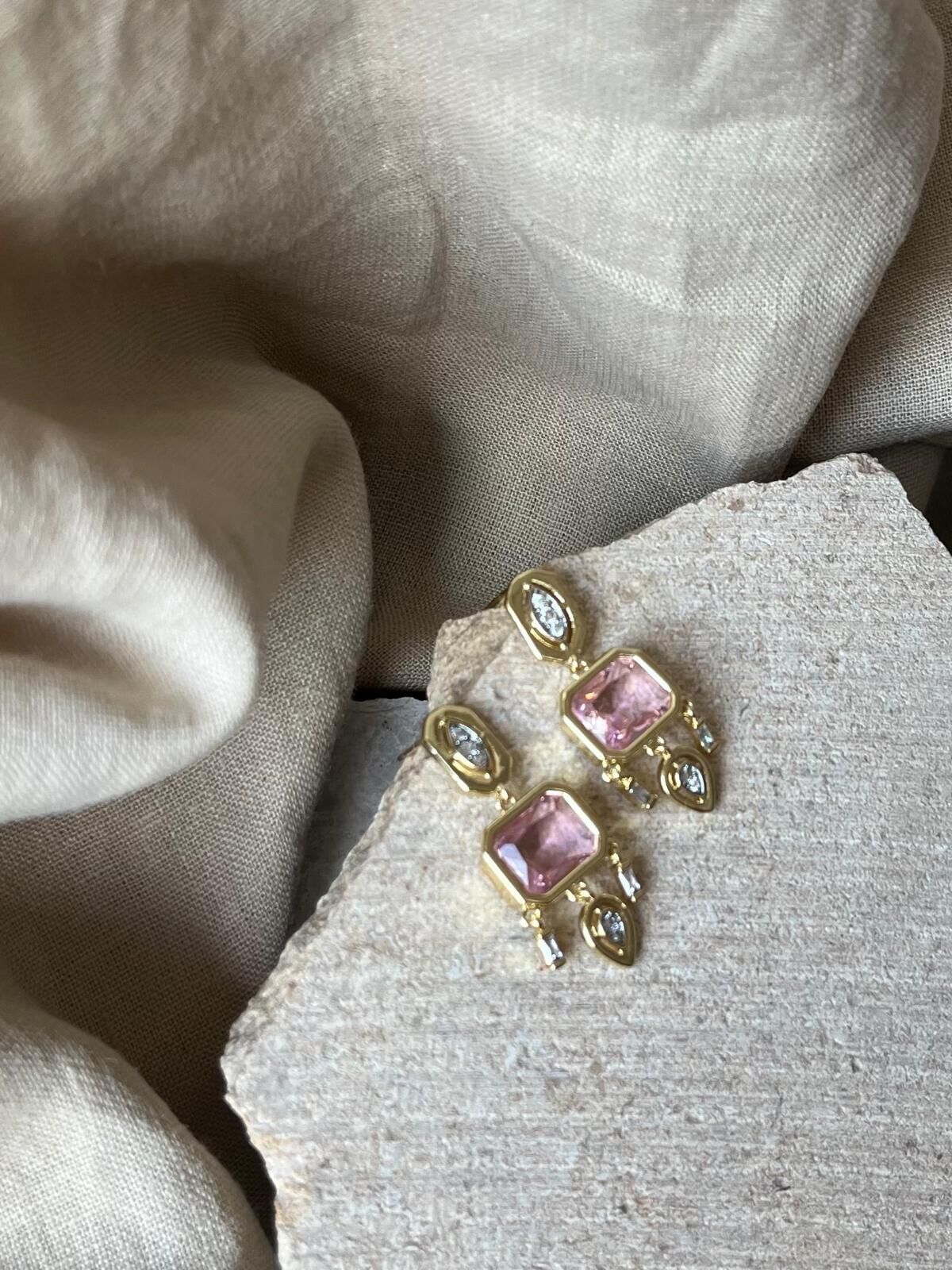 Pembe Taşlı Altın Renkli Küpe