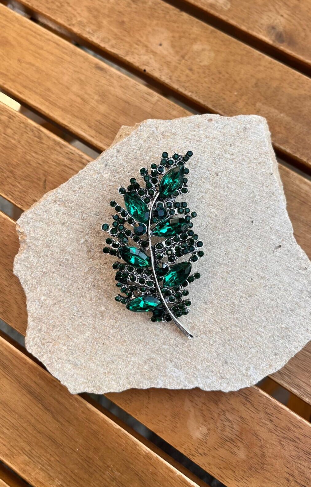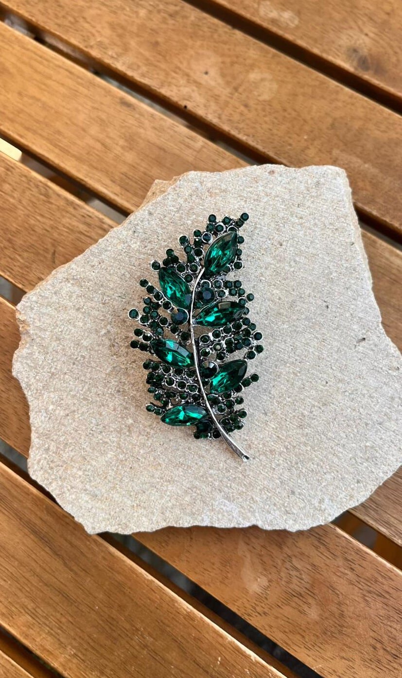 Yeşil Taşlı Yaprak Broş