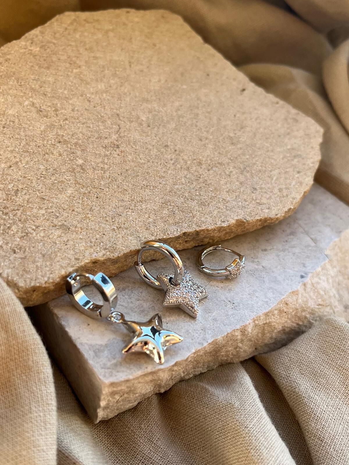 Gümüş Renkli Taşlı Yıldızlı Üçlü Küpe
