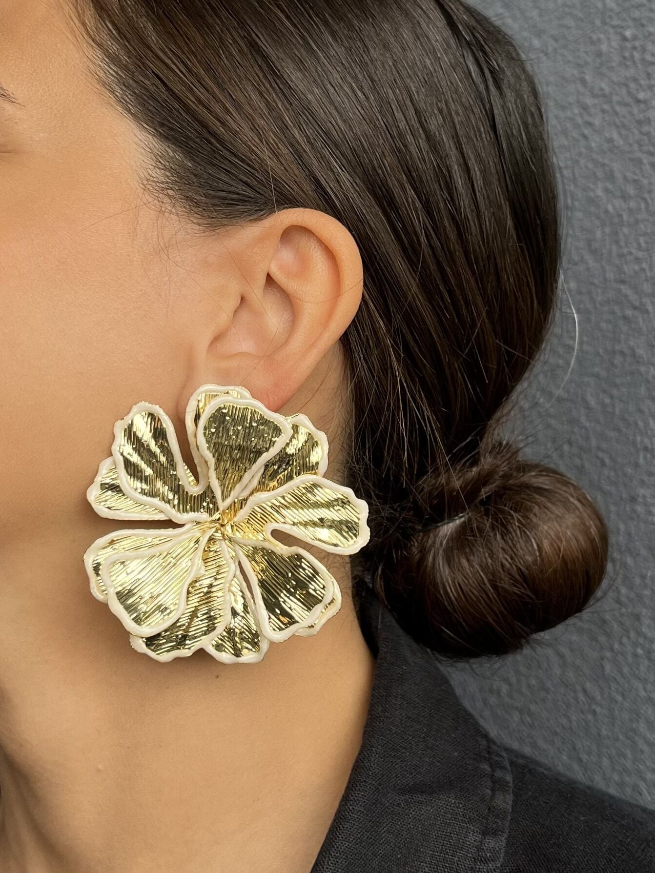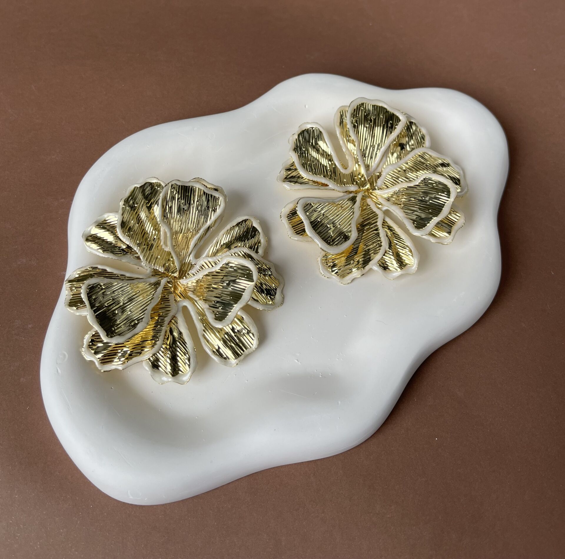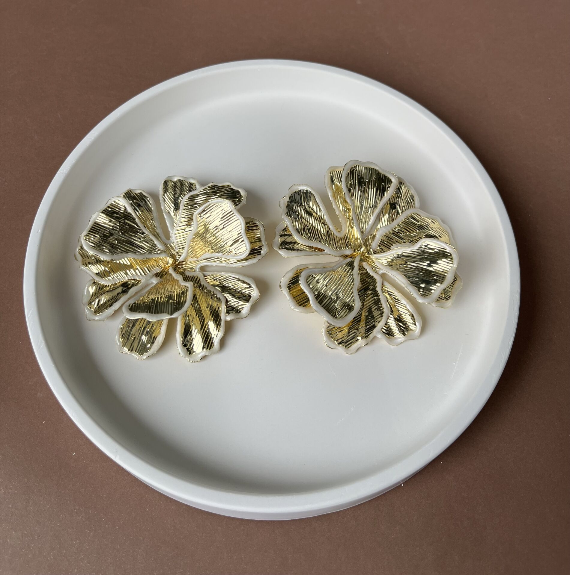 Beyaz ve Altın Desenli Büyük Yaprak Küpe