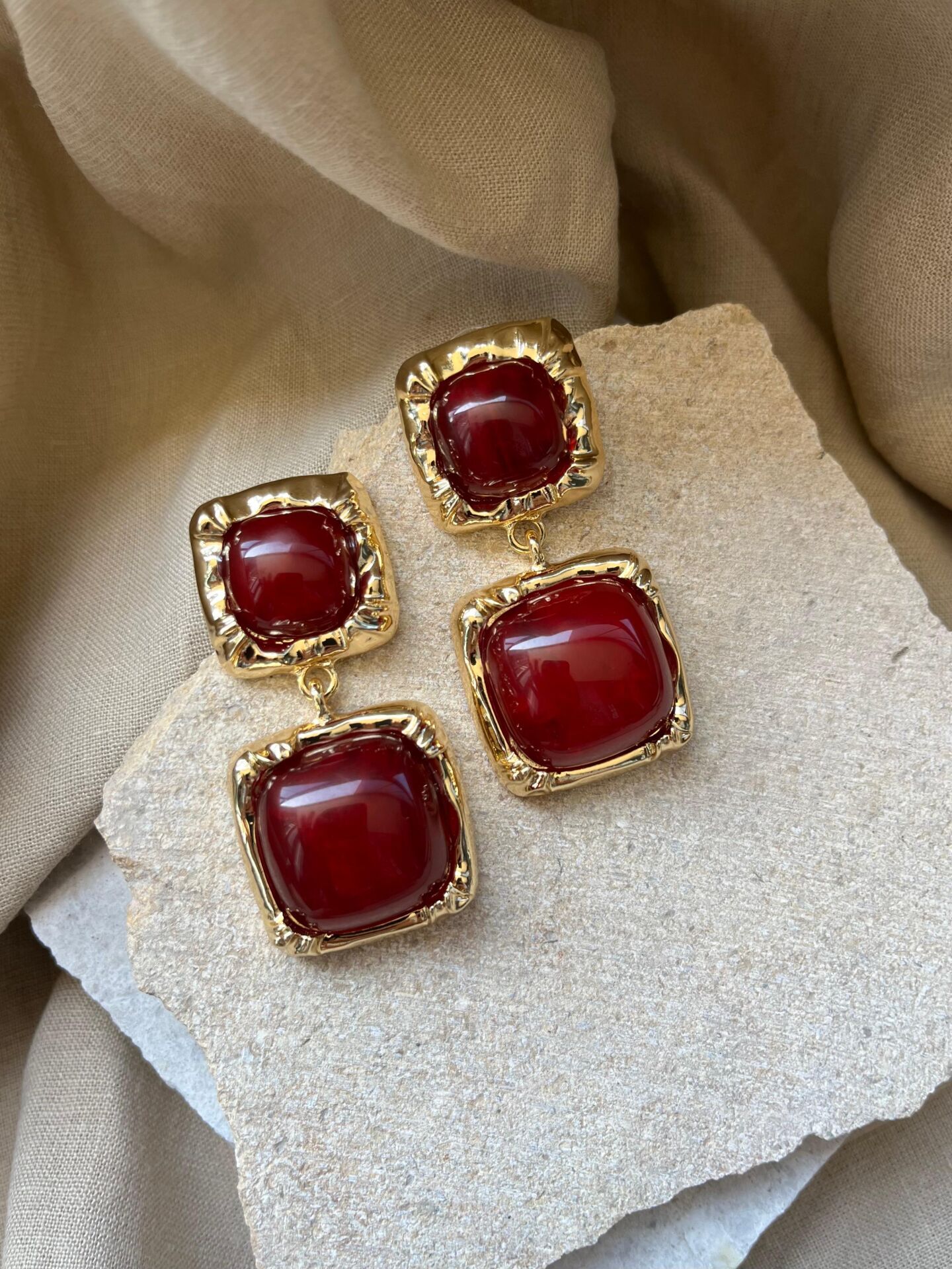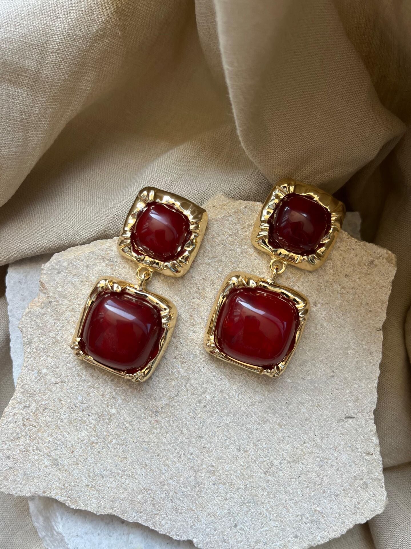 Kare Altın Renk Çerçeveli Bordo Taşlı Küpe