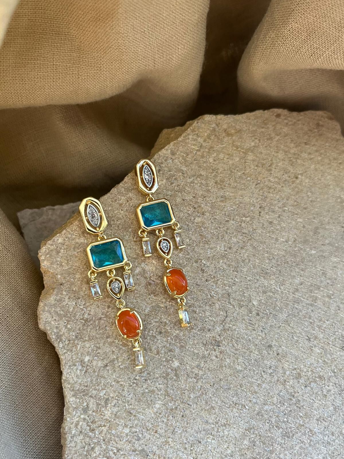 Mavi Turuncu Taşlı Sarkıt Küpe