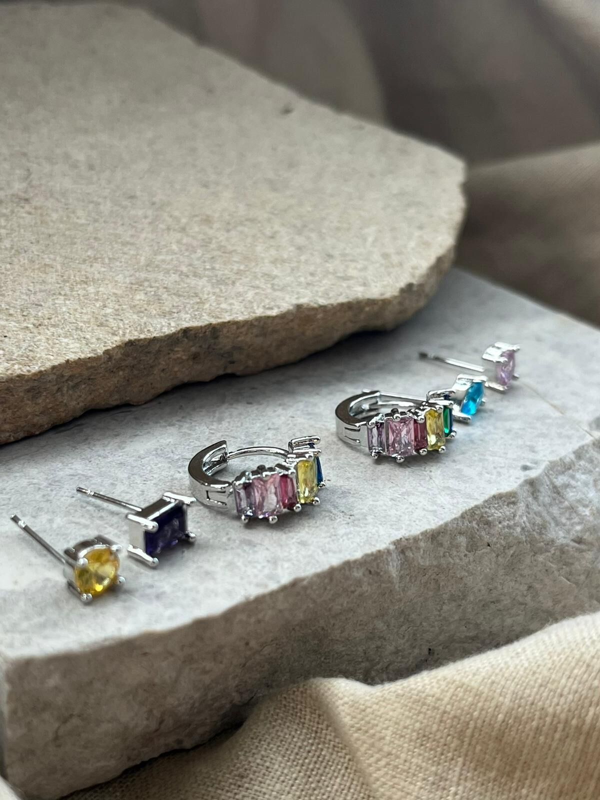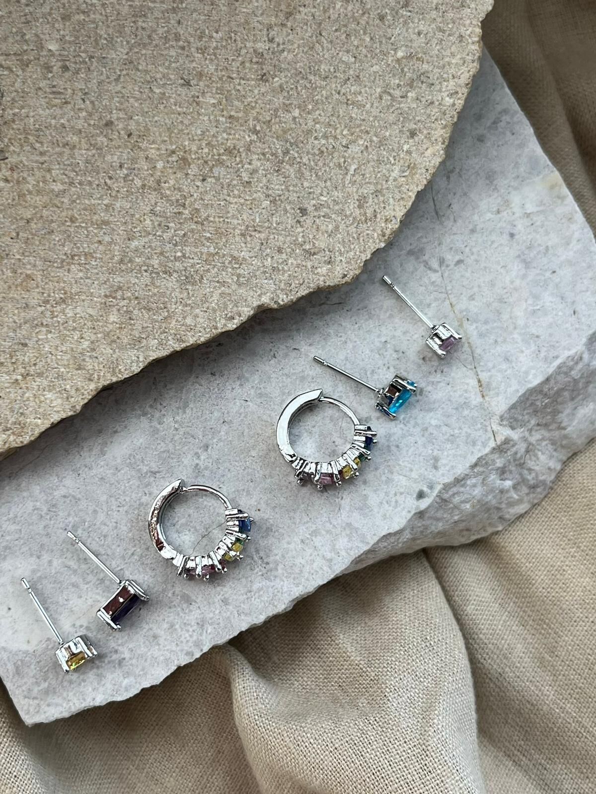 Renkli Taşlı Gümüş Renkli Altılı Küpe